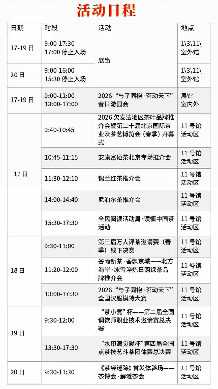 01展会时间4月17日—19日9:00—17:30(17:00停止入场)4月20日9:00—16:00(15:30停止入场)02展会地点北京・全国农业展览馆(1、3、11 号馆及室外馆)03领票方式关注【北京茶博会】公众号,点击菜单栏【领门票】完成观众预登记,即可免费领取电子门票,凭码即可现场入场!