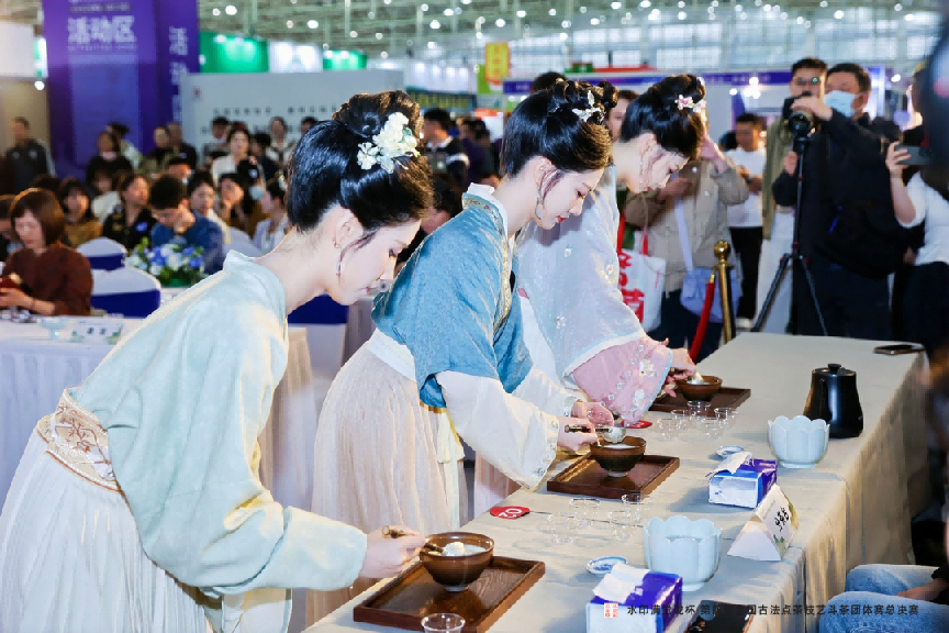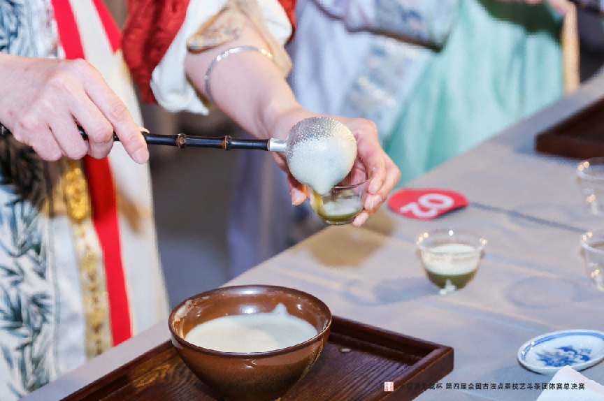 下午,“水印满觉陇杯” 第四届全国点茶技艺斗茶团体赛总决赛开赛。各队伍复刻宋代茶事盛景,按古法完成碾茶、罗茶、点茶全流程比拼,并现场演示茶百戏,让非遗点茶技艺生动呈现、焕发新生。